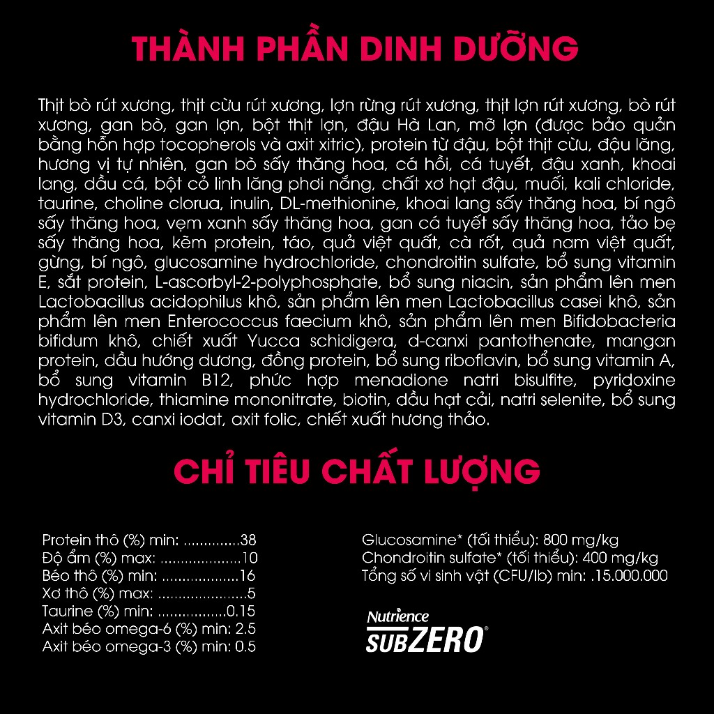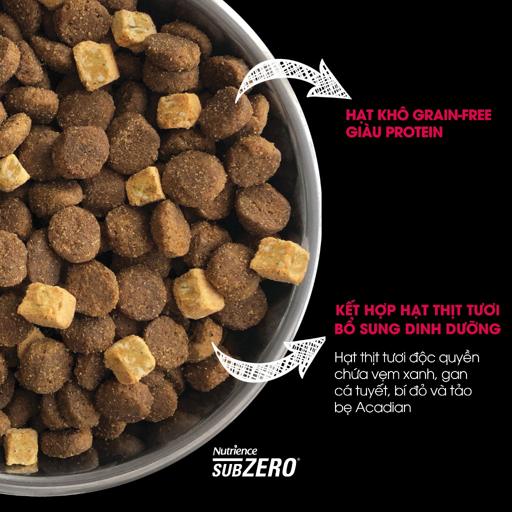 Hạt khô giàu đạm được kết hợp với hạt sấy thăng hoa Nutriboost – là khối thịt bò sống được sấy thăng hoa (giữ trọn dưỡng chất và hương vị tự nhiên), đồng thời được bổ sung vẹm xanh giúp hỗ trợ khớp, bí đỏ giúp tốt cho tiêu hóa, dầu gan cá tuyết giàu omega-3 và tảo biển Acadian giúp tăng cường miễn dịch.