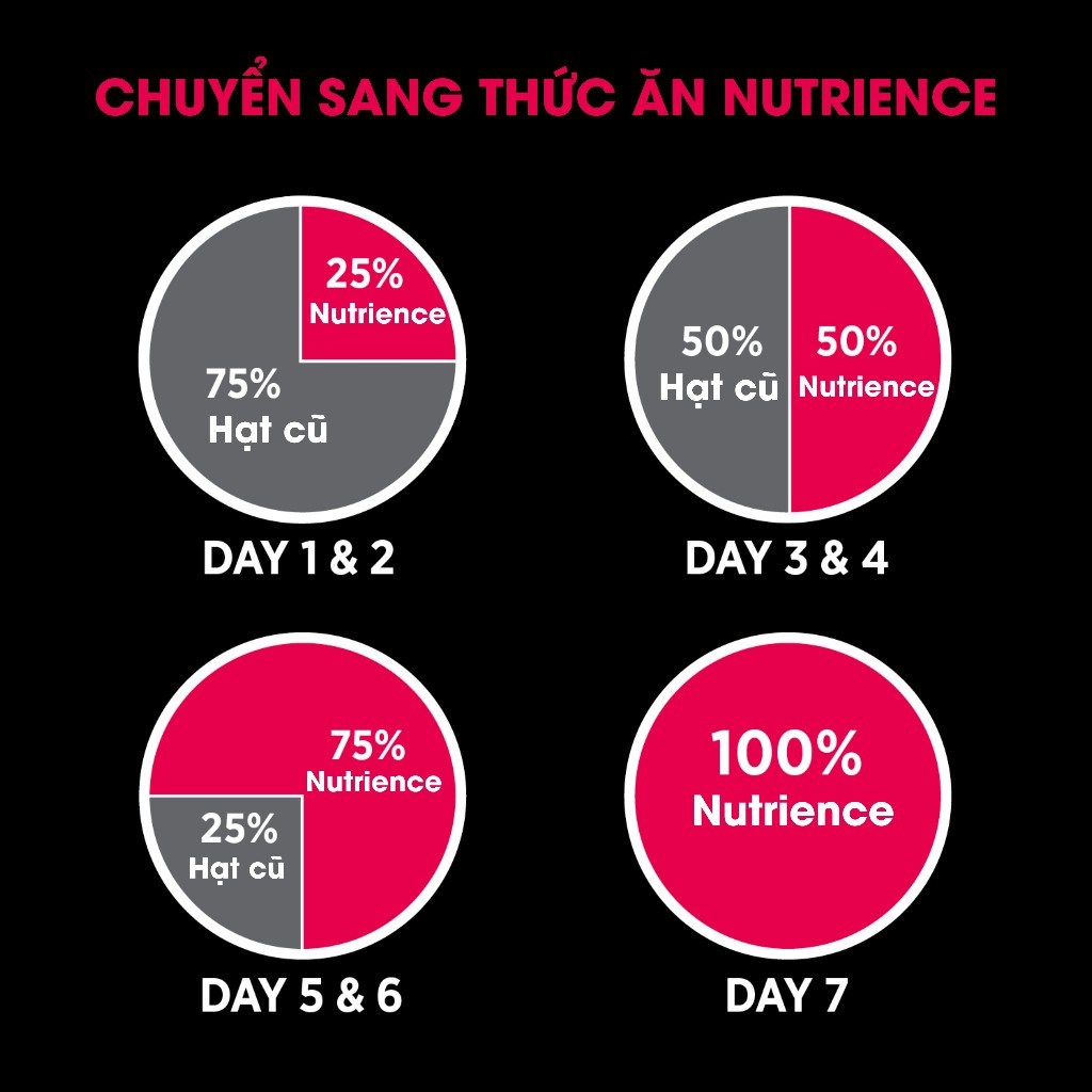 Điều quan trọng là dần dần chuyển từ thức ăn này sang thức ăn khác cho chó của bạn. Bắt đầu với tỷ lệ 25% chất dinh dưỡng cho 75% thức ăn cũ. Từ từ thay đổi tỷ lệ trong 7 đến 10 ngày bằng cách tăng dần lượng thức ăn của Nutrience và giảm lượng thức ăn cũ.