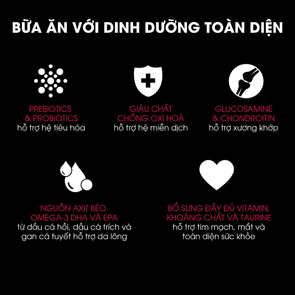 Sản phẩm còn được bổ sung prebiotic và probiotic, giúp cân bằng hệ vi sinh đường ruột – yếu tố quan trọng đảm bảo tiêu hóa và hấp thu dinh dưỡng tối ưu. Hàm lượng omega-3 và omega-6 giúp da khỏe mạnh và lông bóng mượt, trong khi vitamin và khoáng chất thiết yếu giúp tăng cường hệ miễn dịch, tạo nên lớp phòng vệ tự nhiên chống lại các bệnh thường gặp.