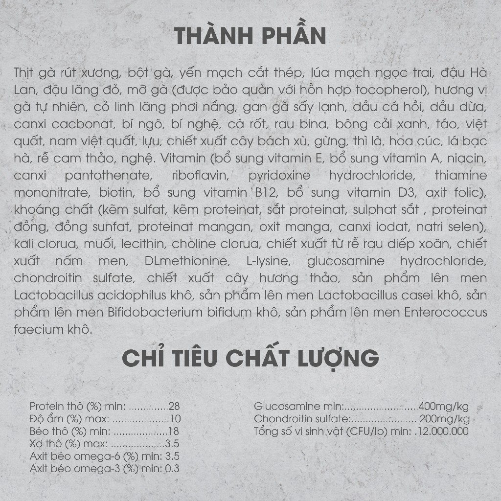 Vitamin (bổ sung vitamin E, bổ sung vitamin A, niacin, canxi pantothenate, riboflavin, pyridoxine hydrochloride, thiamine mononitrate, biotin, bổ sung vitamin B12, bổ sung vitamin D3, axit folic), khoáng chất (kẽm sulfat, kẽm proteinat, sắt proteinat, sulphat sắt , proteinat đồng, đồng sunfat, proteinat mangan, oxit manga, canxi iodat, natri selen), kali clorua, muối, lecithin, choline clorua, chiết xuất từ rễ rau diếp xoăn, chiết xuất nấm men, DLmethionine, L-lysine, glucosamine hydrochloride, chondroitin sulfate, chiết xuất cây hương thảo, sản phẩm lên men Lactobacillus acidophilus khô, sản phẩm lên men Lactobacillus casei khô, sản phẩm lên men Bifidobacterium bifidum khô, sản phẩm lên men Enterococcus faecium khô.