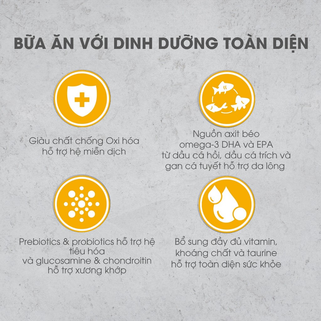 Prebiotics & probiotics mạnh mẽ giúp hấp thụ nhiều hơn các chất dinh dưỡng và thúc đẩy hệ tiêu hóa khỏe mạnh hơn, đồng thời hàm lượng glucosamine và chondroitin tăng lên giúp bảo vệ khớp và hông trong quá trình vận đ