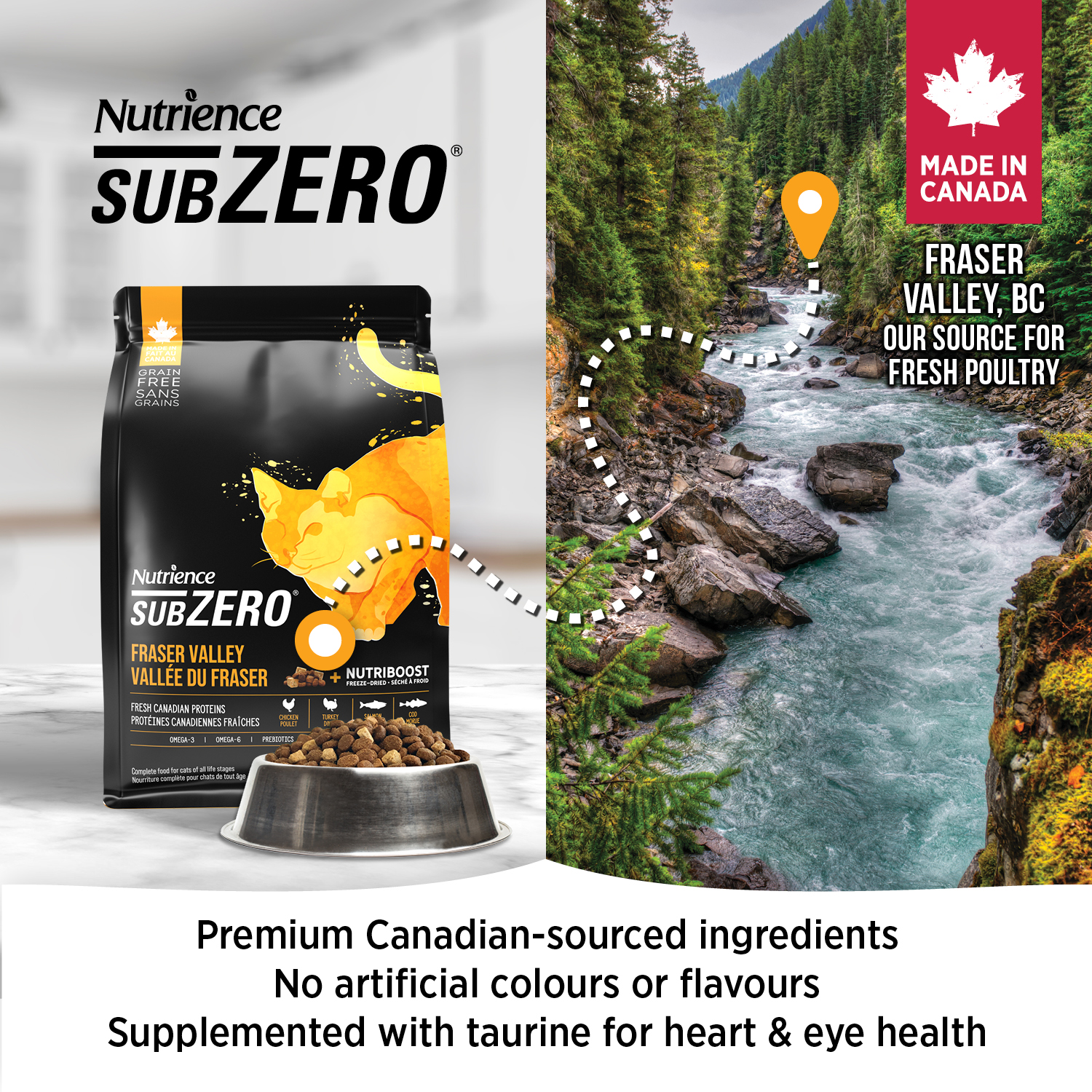 Thức ăn cho mèo Nutrience SubZero Fraser Valley được sản xuất tại Canada và chế biến với thịt gà và gà tây không chứa hormone, kháng sinh từ Fraser Valley, British Columbia và cá được đánh bắt từ vùng bờ biển Thái Bình Dương. Chỉ các loại protein chất lượng cao từ các nguồn đáng tin cậy mới được chọn cho công thức của chúng tôi.