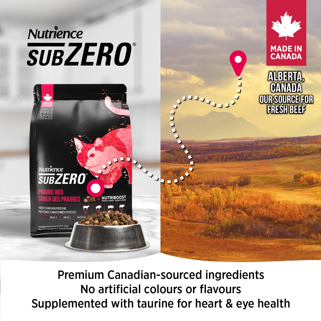 Thức ăn cho mèo Nutrience SubZero Prairie Red được sản xuất tại Canada, chế biến từ các nguyên liệu tươi ngon như thịt bò, thịt lợn, lợn rừng từ Alberta và cá đánh bắt tự nhiên từ bờ biển Thái Bình Dương. Chúng tôi chỉ chọn những nguồn đạm chất lượng cao, đáng tin cậy để đưa vào công thức.