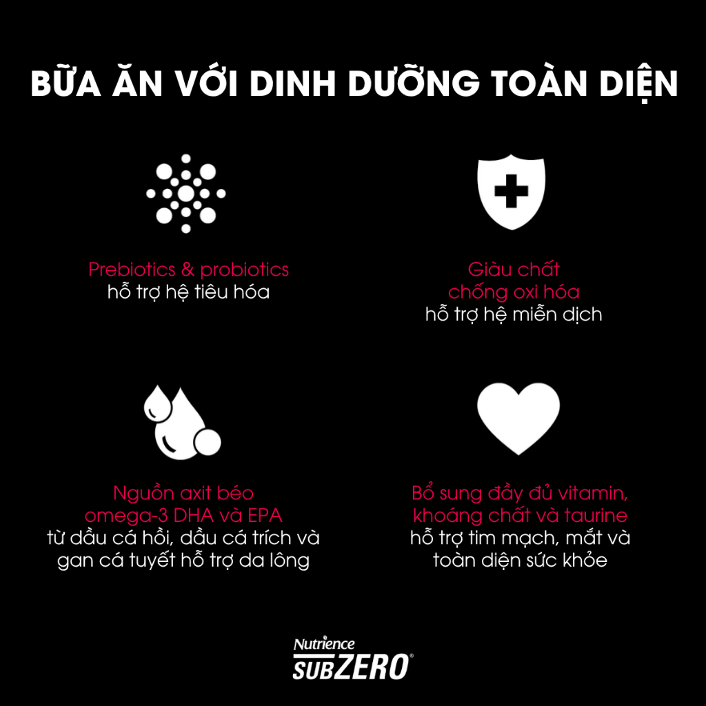 Công thức Nutrience SubZero Prairie Red được thiết kế để đáp ứng đầy đủ các mức dinh dưỡng do AAFCO Cat Food Nutrient Profiles thiết lập cho mọi giai đoạn phát triển của mèo.