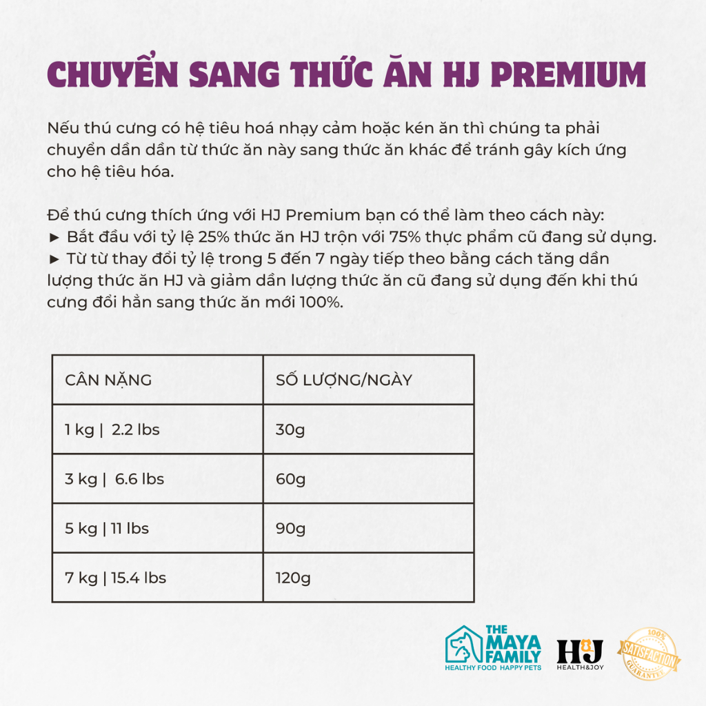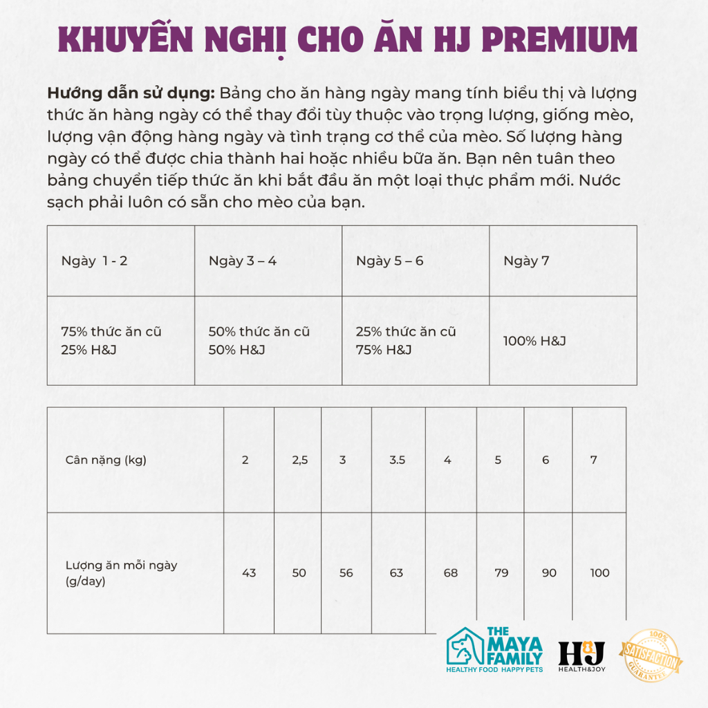 Cho mèo của bạn ăn theo bảng cho ăn hàng ngày được khuyến nghị. Bảng cho ăn hàng ngày mang tính biểu thị và lượng thức ăn hàng ngày có thể thay đổi tùy thuộc vào trọng lượng, giống mèo, lượng vận động hàng ngày và tình trạng cơ thể của mèo. Số lượng hàng ngày có thể được chia thành hai hoặc nhiều bữa ăn. Bạn nên tuân theo bảng chuyển tiếp thức ăn khi bắt đầu ăn một loại thực phẩm mới. Nước sạch phải luôn có sẵn cho mèo của bạn.